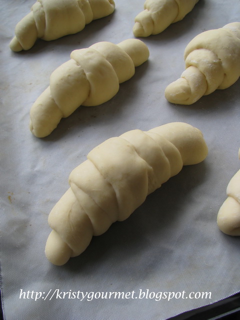 (10) now, roll up dough from the bigger end to the sharper end, to form a croissant shape.